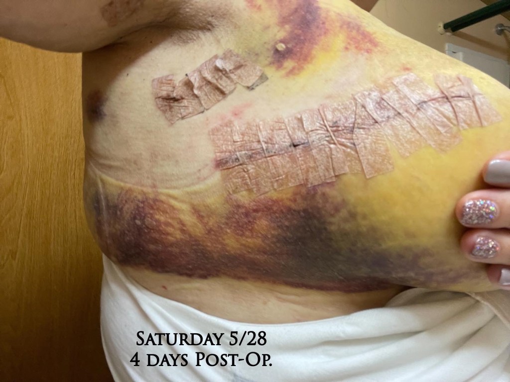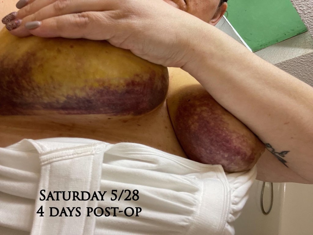 I can’t lift my arm. Expected. But the bruising. The bruising is bad. And I’m not sharing for reactions, I’m sharing so the next woman who wants to know and looks can be prepared.