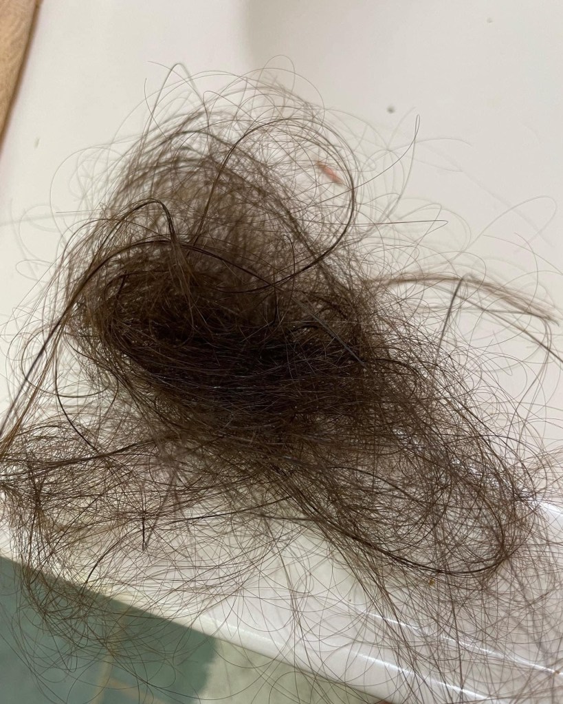 A lot of hair came out in the shower Friday morning… and continued to do so all weekend… there were lots of tears and breathing exercises, Jacqueline O’Kane (why can’t I tag you lol) came to my rescue and cut it for me so I didn’t have to keep pulling these incredibly long stands of hair from my head. I couldn’t shave it. Not yet. I know I may get there but this was traumatizing enough. If you know me, you know I hate my hair short so there’s several levels of trauma going on here.